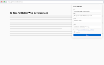 Marks is a lightweight and user-friendly bookmark manager extension designed for Chrome users, providing an efficient way to save and organize web pages. With its one-click saving feature, users can quickly capture the URL and title from the current tab, making it easier to keep track of important resources. The extension includes AI-suggested tags that offer smart recommendations based on the content of the page, alongside options for adding custom tags and notes, and marking pages for later reading.